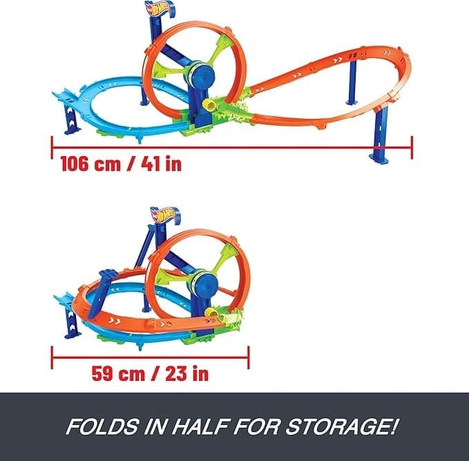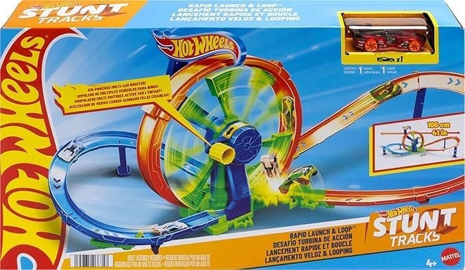O conjunto de jogos Rapid Launch & Loop da Hot Wheels inclui uma roda com manivela que impulsiona os carros para os lançar por looping, curvas e zona de choques várias vezes!