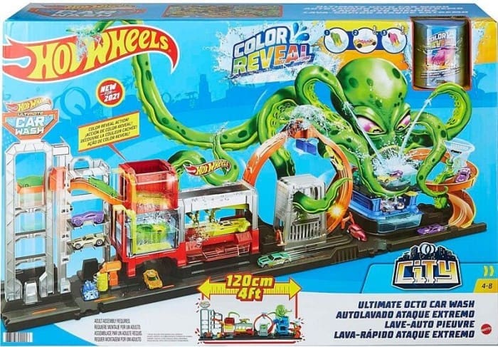 O Auto lavado ataque extremo de Hot Wheels® City está repleto de impressionantes loucuras e aventuras do mar, com um tamanho a mais de 1 metro de longo, inclui um carro. Percorre com o carro a pista -que inclui um looping. Podes encher a cabeça do polvo com água fria para revelar outra decoração diferente do polvo maluco. Os veículos também mudam de cor.