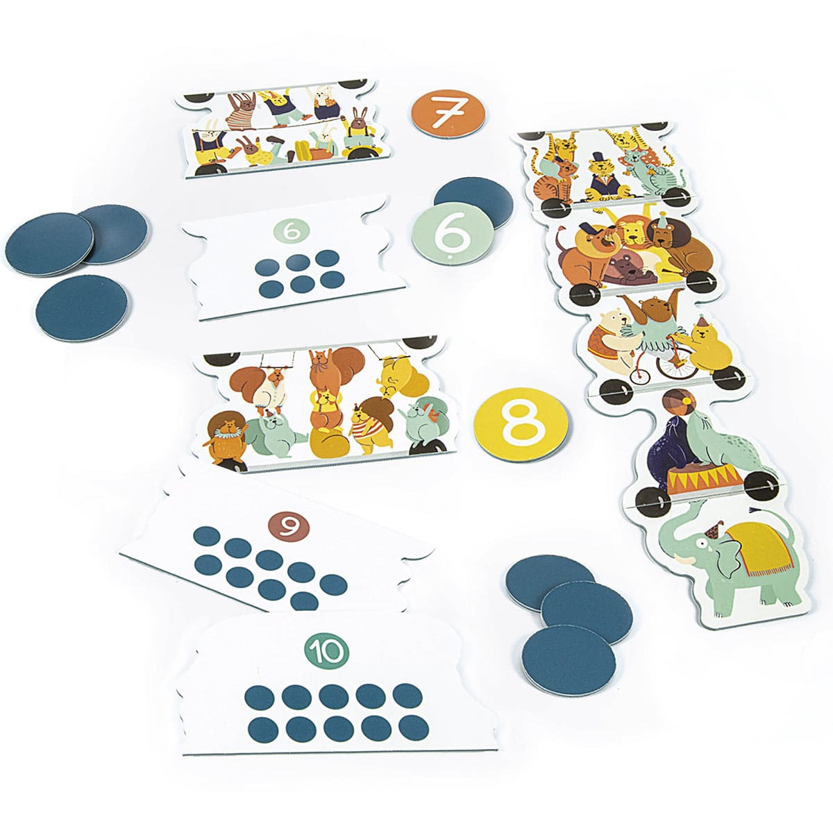 Um jogo cativante e divertido com muitas peças ilustradas com queridos animais para serem descobertos enquanto aprendes a contar. Este conjunto de jogos é simples e intuitivo, e foi desenvolvido para introduzir as crianças aos seus primeiros conjuntos e conceitos matemáticos. As peças correspondentes têm a mesma cor para ajudar a sua criança a ligá-las. Quanto maior o número de animais em exposição, maiores se tornam as peças, que quando organizadas em ordem ascendente formam uma pirâmide!