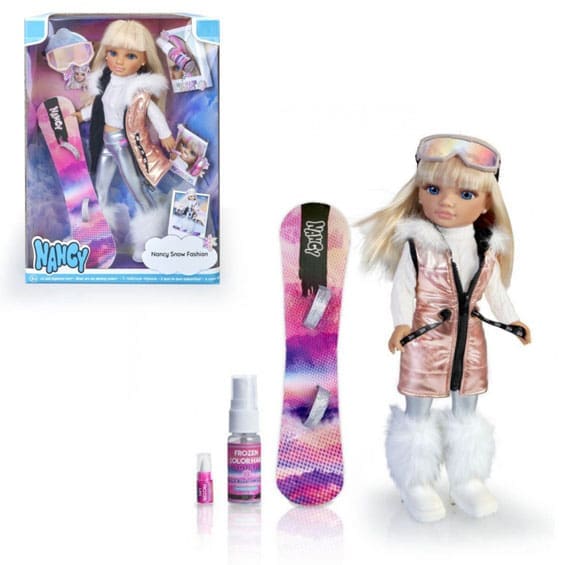 Nancy vai para a neve nas montanhas. Com óculos da neve, colete metálico com pelo no capuz para combinar com as suas botas e leggings prateados. Também usa batom incluído. A aplicação de água fria com o spray incluído fará sobressair destaques cor-de-rosa no seu belo cabelo louro com franjas. Nancy com muito estilo. Adequado para crianças a partir dos 3 anos.