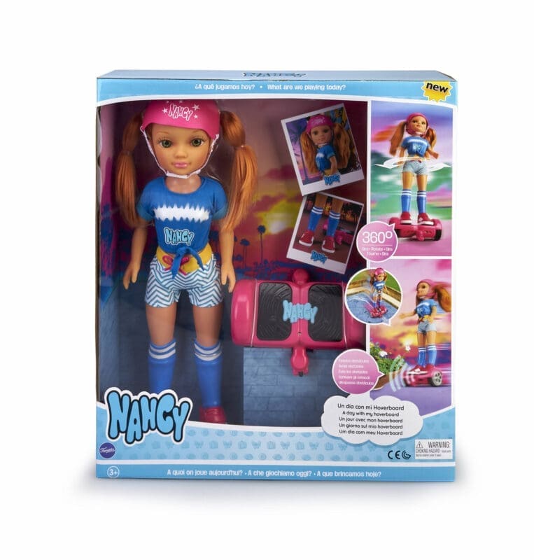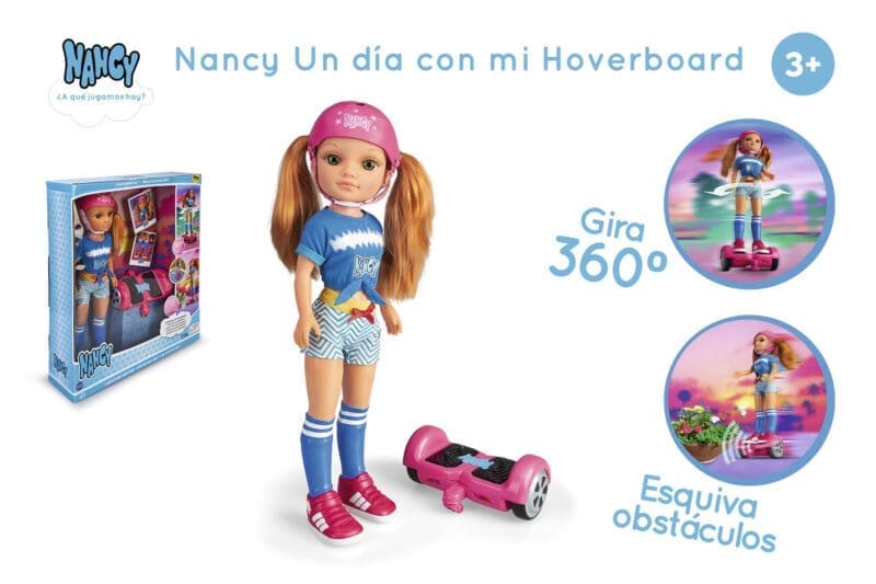 Tem um hoverboard cor de rosa que funciona a sério. Anda para trás e para a frente e o mais alucinante é que pode dar voltas de 360º, além de ter um sensor de obstáculos. Nancy com o cabelo ruivo e dois apanhados, tem um look moderno de patinadora, com capacete e sapatilhas cor de rosa. Passa horas de diversão, com a boneca que nunca se separa do seu hoverboard.É simplesmente ESPETACULAR.