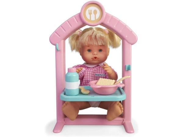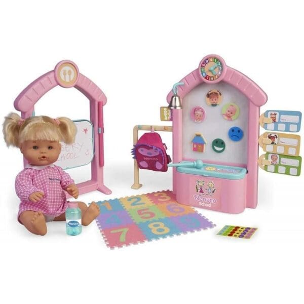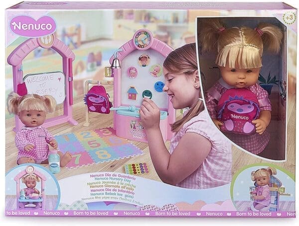 Nenuco Dia de Infantário é o infantário de Nenuco. Tem quatro áreas diferentes para brincar: o cantinho de jogos, o de arte, o refeitório e a casa de banho.Prepara a mochila do Nenuco com o seu almoço. Ao chegar ao infantário, senta-o no tapete para a chamada e a aulinha. O quadro transforma-se num refeitório! E atrás da sala de aula… está a casa de banho, para o Nenuco fazer chichi! O Nenuco Dia de Infantário é um playset supercompleto que inclui um Nenuco, de corpo duro de 35 cm, e mais de 10 acessórios. Super Divertido brincar em casa e no infantário.