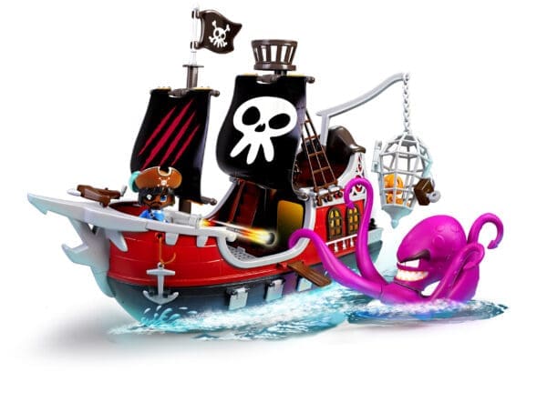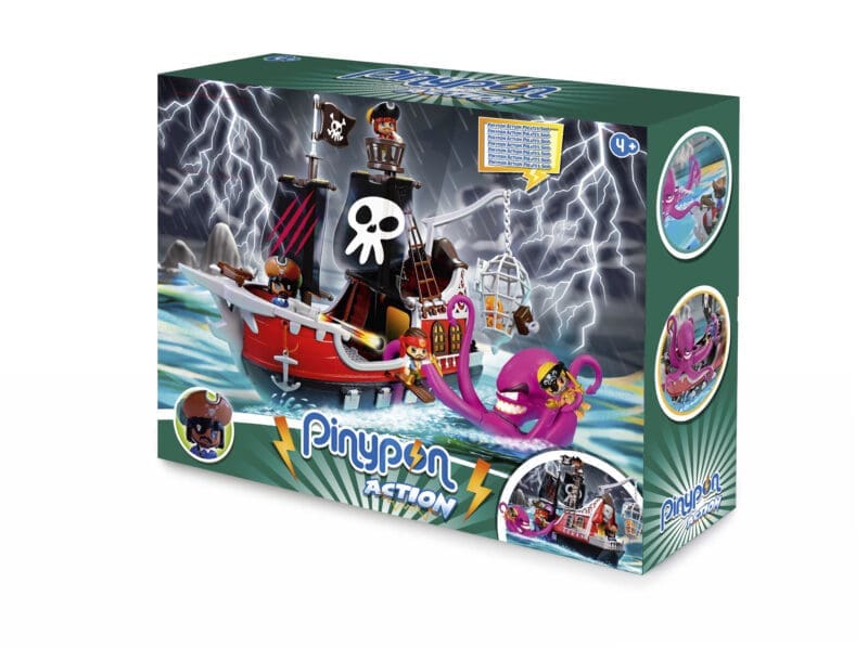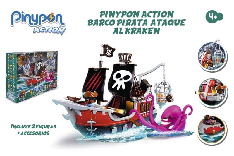 Viva as aventuras mais emocionantes com o Navio Pirata Pinypon Action, com o qual você pode jogar tanto na terra quanto na água. Dispare o canhão, prenda os seus inimigos na jaula, faça-os atravessar a mesa e lutar contra o Kraken, o polvo gigante que inclui junto com o capitão e acessórios.