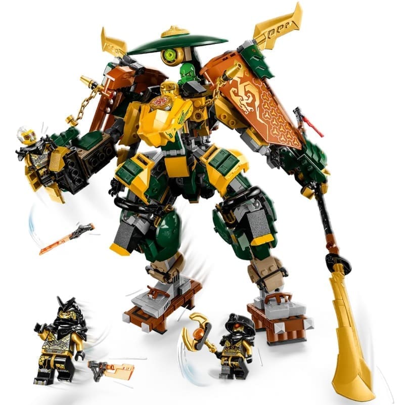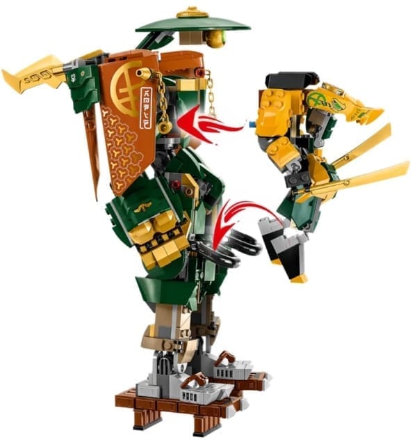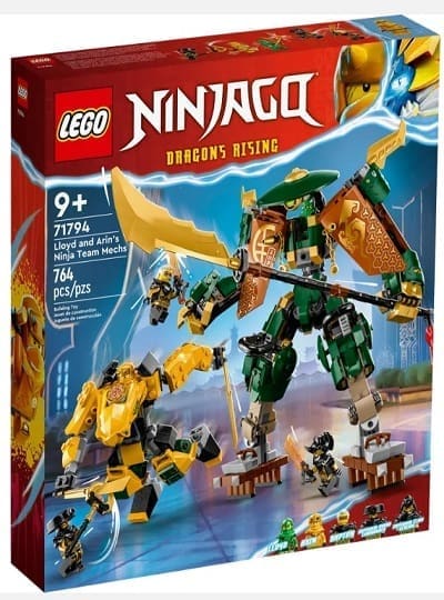 NINJAGO® Dragons Rising , set Mechs da Equipa Ninja de Lloyd e Arin (71794). Este set de construção nunca antes visto apresenta os robôs ajustáveis do ninja master Lloyd e do seu aluno Arin, que podem ser unidos para criar 1 robô maior e fortemente armado para infinitas oportunidades de brincadeira.5 minifiguras para batalhas épicas